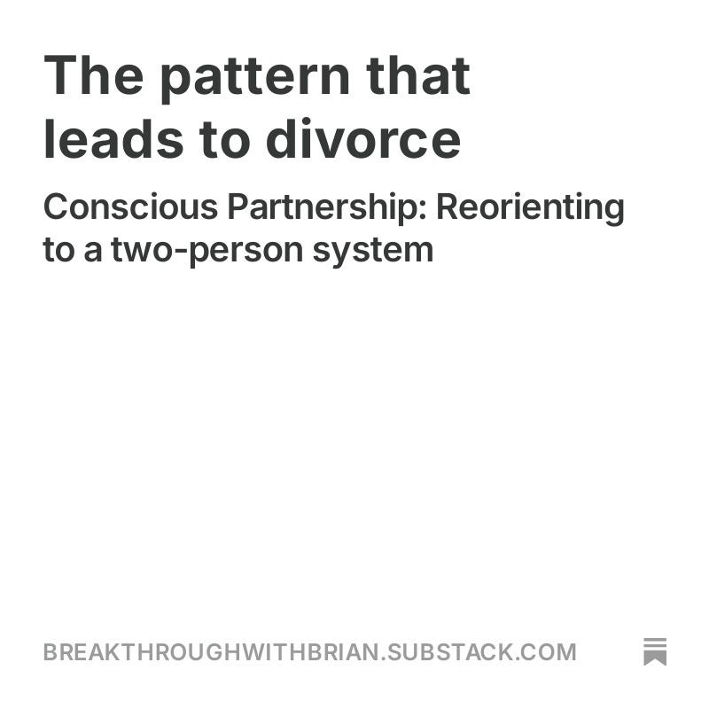 Empath's Corner PodcastThe pattern that leads to divorce11×0:00Current time: 0:00 / Total time: -21:04-21:04Audio playback is not supported on your browser. Please upgrade.The pattern that leads to divorceConscious Partnership: Reorienting to a two-person systemBrianSep 16, 20241ShareTranscriptI’m curious, what was your golden nugget take away from this audio episode?Check out my latest writings:Give your partner leverage to influence you.Before you can truly enter partnership, with your heart open, you must complete your individual pasts.Discussion about this episodeCommentsRestacksEmpath's Corner PodcastFree yourself w/ no BS insights on boundaries, intimacy and relationshipsFree yourself w/ no BS insights on boundaries, intimacy and relationshipsSubscribeListen onSubstack AppRSS FeedAppears in episodeBrianRecent EpisodesBoundaries & Touch WorkshopOct 16, 2024 • Brian